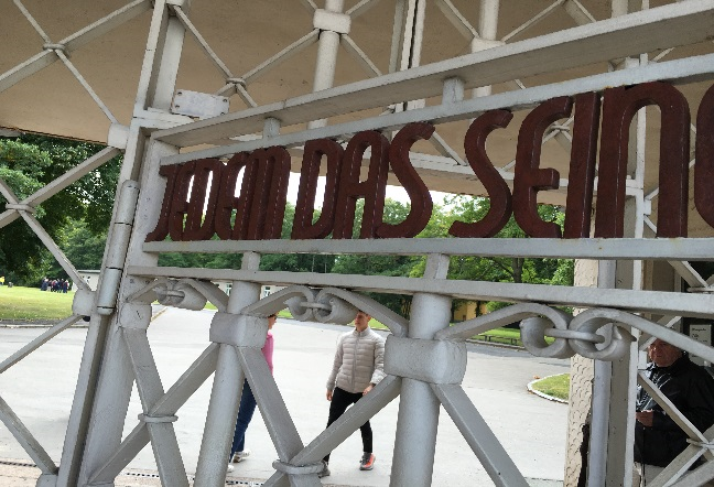 Nach dem Rundgang hatten wir Zeit, das Gelände eigenständig weiter zu erkunden. Unser erster Blick ging zum Lagertor. Die Inschrift „Jedem das Seine“, ein Ausspruch Platons, sollte den Häftlingen ihre Ausweglosigkeit verdeutlichen. Ursprünglich zielte er auf Gleichheit und Gerechtigkeit ab. Jedem soll das zugeteilt werden, was ihm gebührt, doch die Nazis legten das ihrer rassistischen Ideologie entsprechend aus. Anschließend besichtigten wir die ständige historische Ausstellung des Konzentrationslagers, welche uns auf mehreren Etagen einen kleinen Einblick in die individuellen Schicksale der Inhaftierten gab. Originale Häftlingskleidung, Dokumente und viel Bildmaterial trugen zum Verständnis bei.